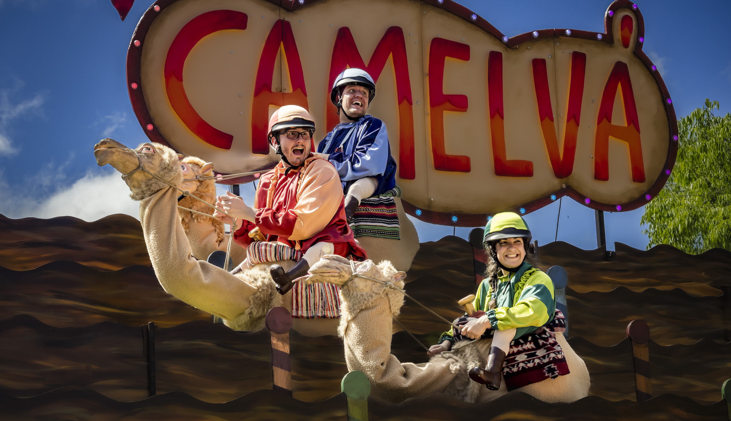 Un espectacle de carrer que convertirà la plaça en un joc gegant en viu. Els corredors, muntats als seus camells, prenen posicions mentre els astuts firaires seleccionen els pròxims jugadors d’entre el públic; seran els encarregats de llançar i encertar les boles als forats per fer avançar els seus genets. Sense saber-ho, es trobaran immersos en una competició on l’absurd mana i els camells… bé, els camells no sempre segueixen les normes.