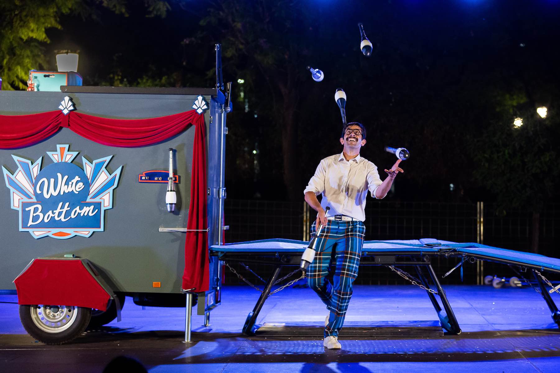 Sabates de xarol, un escenari sobre rodes, un trampolí rescatat de l’oblit. Aquest showman autèntic i atemporal, per fi es troba amb l’arribada de la nova dècada daurada que tant ha esperat, els anys vint són aquí. Un segle més tard! Desubicat en el temps, però ubicat a l’espai, per tal de sorprendre, divertir i emocionar, el nostre protagonista està en flames, disposat a aixecar el seu “White Bottom” del sofà, i fer el salt… El seu moment, per fi ha arribat!