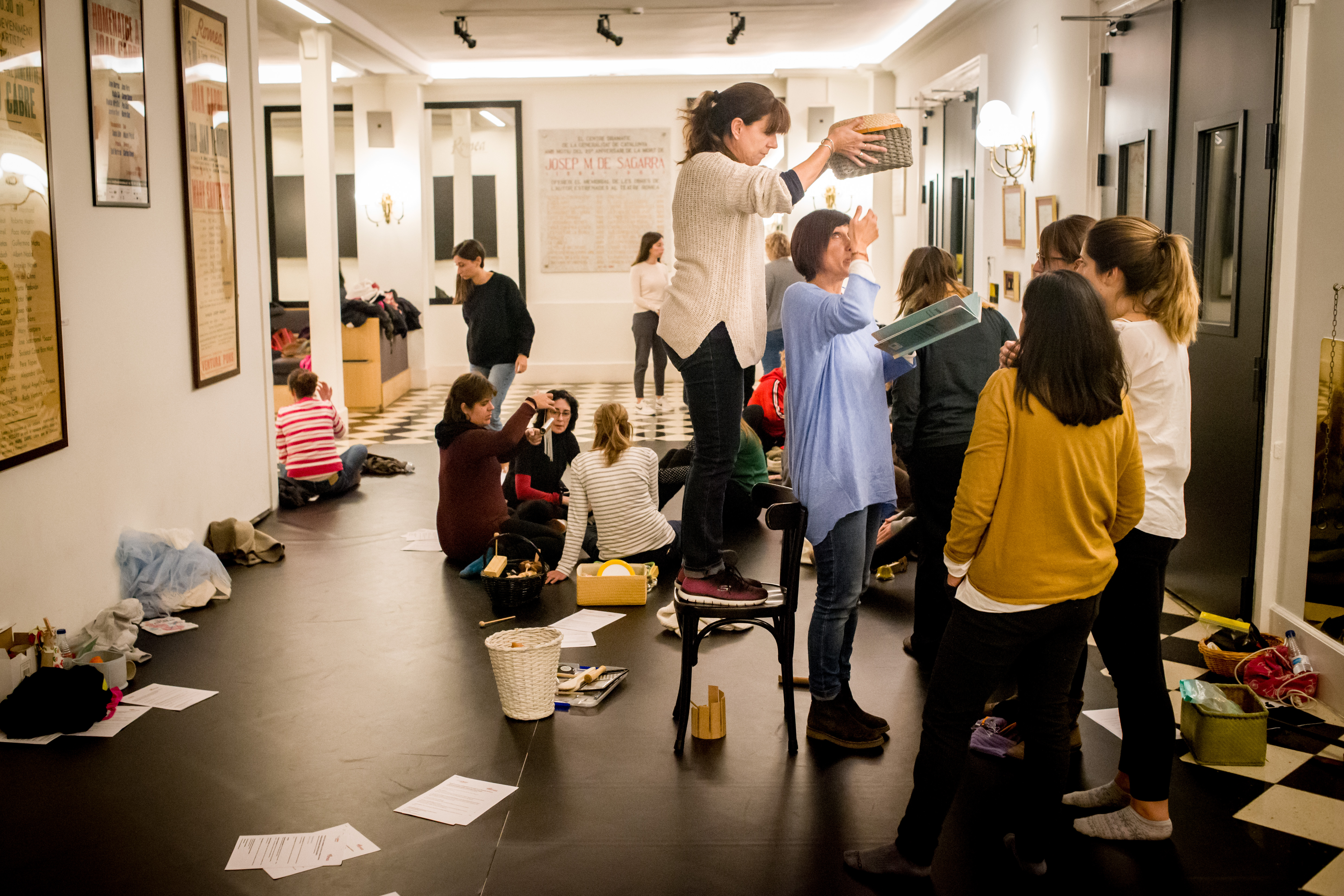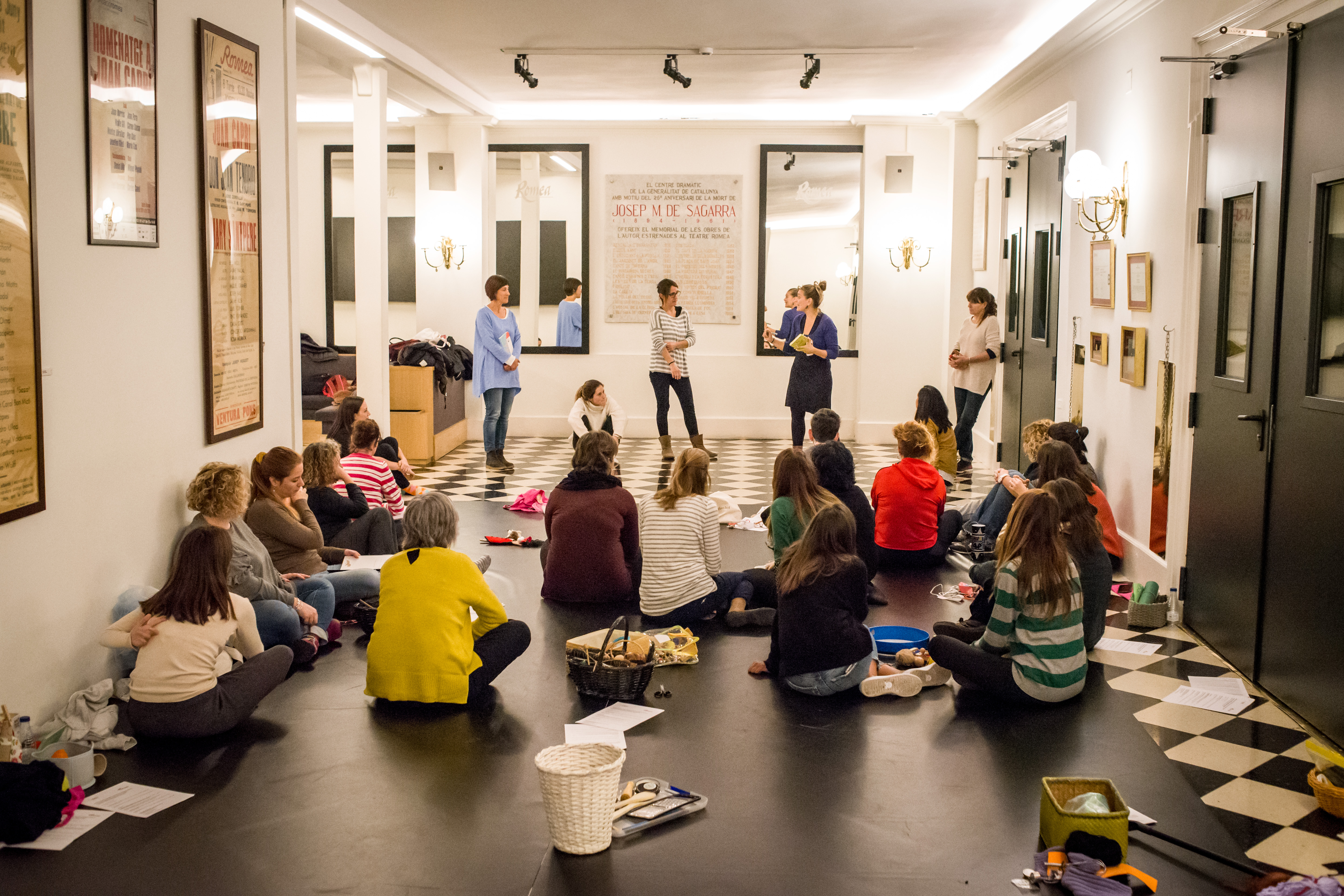 This first day of training took place at the Teatre Romea and was directed by the actress Maria Santallusia. The session from 9 am to 3 pm served to break the ice and learn how to dramatize the stories by working with the voice, the puppets and the body itself.